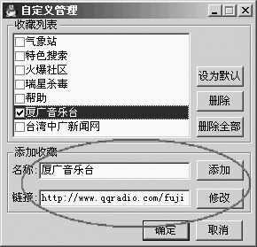 弹出“自定义管理”窗口,在“添加收藏”中填入电台名称和链接,点击“添加”即可(如图2)。