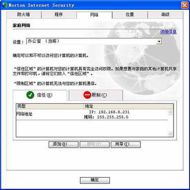 对于计算机之间的访问安全,可以通过设置“信任区域”和“限制区域”来加强。单击程序选项卡,用户可以通过“添加”按钮对“信任区域”和“限制区域进行限制”。例如,办公环境下的局域网用户需要和其他用户进行文件和打印机共享,就需要在“信任区域”中输入对方的IP和掩码,如图4所示。