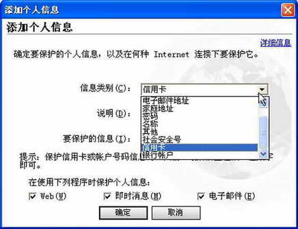 隐私控制功能提供了保护个人隐私的解决方案。启动隐私控制后,在下拉列表框中选择要进行隐私控制的用户,选中“打开隐私控制”复选框,选择隐私控制的默认级别。再单击“个人信息”按钮添加需要保护的个人隐私,如我们在网站购物和在线支付时使用的信用卡号、电子邮件地址、常用密码、电话等信息,如图7所示。对于信用卡卡号和银行账号,用户只需要输入后面的5位或6位数字即可。