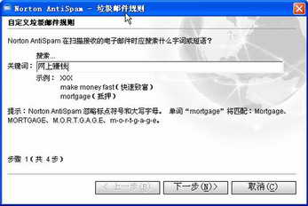 垃圾邮件真可谓防不胜防。无论是免费邮箱还是单位的工作邮箱,每天都会有大量的“不速之客”。有了Norton Antispam,用户的信箱肯定会干净不少。在安装完NIS后,Norton Antispam会自动嵌入到Outlook Express中。用户可以通过Norton Antispam窗口中的常规选项进行筛选级别设置,在允许列表中设置愿意收到的邮件的地址,在禁止列表中设置不愿意接收的邮件的地址,通过垃圾邮件规则设置,用户还可以自定义垃圾邮件规则。图8为在垃圾邮件规则中添加关键词的示例。