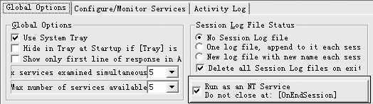 默认情况下,32BSMNTR没有运行在系统服务状态下,这样每次都要手工运行程序是非常麻烦的。在“32bit Service Monitor”主程序窗口中,切换到“Global options”标签页,勾选“Run as an NT Service”选项(图1),随后会弹出信息提示框,点击“是”按钮,重新启动系统就完成了32BSMNTR监控服务的安装。