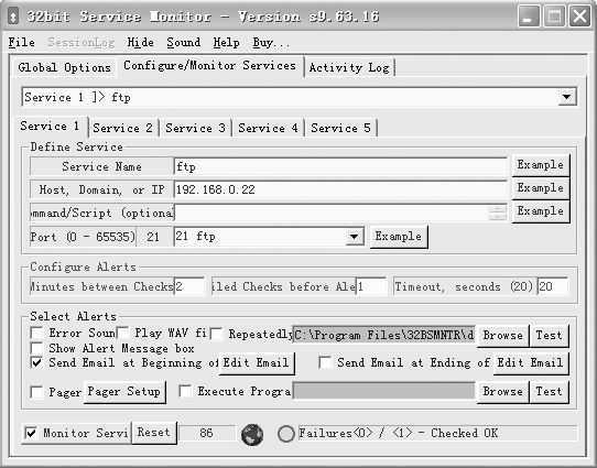 进入“Configure→Monitor Services”标签页(图2),32BSMNTR可以同时对五个服务器进行监控,在这里进行FTP服务器监控参数的设置。
