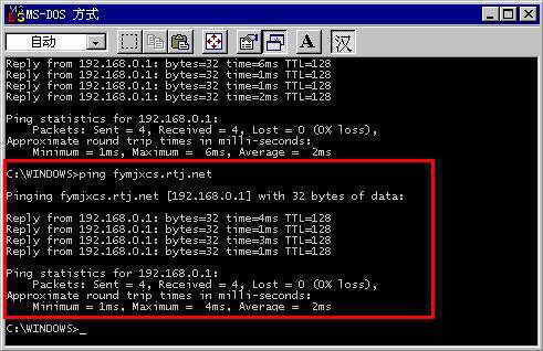完成以上设置后,可在客户端使用Ping命令测试任意二级域名解析是否成功。例如,在命令提示符下输入“Ping fymjxcs.rtj.net”命令,得到如图所示的响应信息,就表示泛域名解析成功。