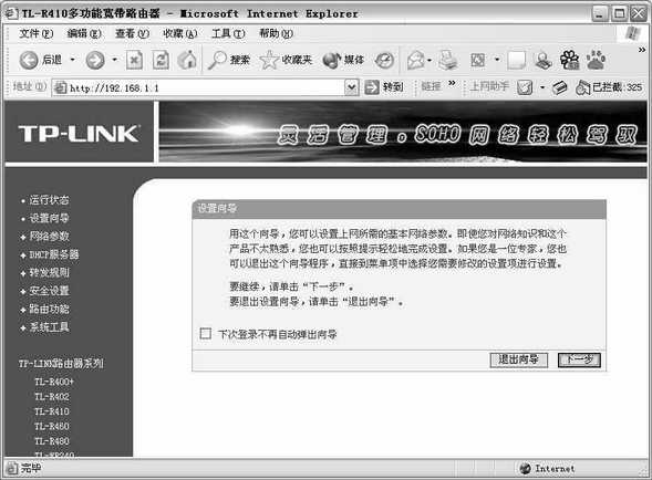 无论是家庭用户还是SOHO用户,都不可能聘请专职的网管,因此,网络设备的傻瓜化配置与管理就显得非常关键。傻瓜化表现在三个方面,一是配置的傻瓜化,要求产品有全中文的配置界面和详尽的中文说明书,全程的中文配置向导,使用户能够一步步地完成各种Internet接入方式的配置过程;二是连接的傻瓜化,要求所有端口全部采用智能端口,能够自动判断连接端端口类型;三是恢复的傻瓜化,按下某个按钮即可恢复路由器的出厂默认值,用户不必担心配置错误,当系统发生故障或死机时,只要简单地关闭并打开电源,即可恢复路由器的正常工作,确保任何用户都能从容应对不可预知的各种故障。