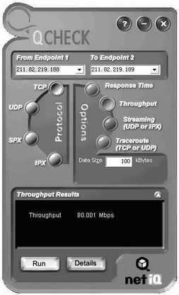 路由器的吞吐量可以借助软件QCHECK进行测试。QCHECK是NetIQ公司开发的一款免费网络测试软件,被NetIQ称为“Ping命令的扩展版本”,它可以简单测试网络的响应时间和数据传输率。测试时使用两台计算机,一台接路由器WAN口,一台接LAN口。其中,TCP/UDP传输率测试表明路由器的吞吐量(Throughput)。测试中,从一个客户端向另外一个客户端发送文件,然后测试所消耗的时间,并计算出传输率(以Mbps为单位),测试结果越高越好,100Mbps端口的理论值最高为94Mbps(传输率)。