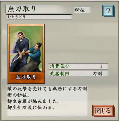 1562年8月份,柳生宗严开创的新流派──柳生新阴流。去找他,向他拜师就可以学到刀剑系的最强秘技“无刀取”(只消耗一个气合值,所以实用性极高),效果是无视对方的一次攻击,包括攻击性的秘技。这之后,在与上泉信纲战斗中,一旦发现对方气合值蓄满,马上使用“无刀取”,这样就不再怕“转”了,用“霞”配合普通攻击,再加上少许的运气,战胜他也不难。另外,最好不要试图用刀剑以外的武器去挑战上泉信纲,两个“转”的间隔之内你几乎不可能将其体力削减到零。而你被“转”之后,体力至少被削去90%。