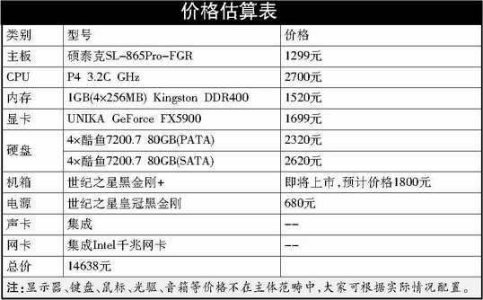 也许普通用户会将这套总价值14638元的PC服务器和“奢侈”等同起来,的确,作为PC,它是豪华的,但相对于购买硬件服务器,它的性价比还是相当高的。何况,它的价格伸缩余地还非常大。大家完全可以把8个80GB的硬盘,换成4个SATA 160GB,这样可节约720元(以SATA版希捷酷鱼7200.7为例);把1GB的内存换成512MB(不过还是要保证是双通道哟),可以便宜760元(以Kingston DDR400为例)。以上两项改动后,性能几乎不会有多大变化。如果我们仅仅是拿它当服务器用,还可以把CPU换成P4 2.6C GHz,这就又可以节约1300元;然后把显卡换为400元左右的GeForce FX5200,又可以便宜1300元!这样,在整体价格上,就可以便宜4080元,性价比就更为突出了。各位正在为买不起硬件服务器而发愁的朋友,现在是不是看到曙光了呢?