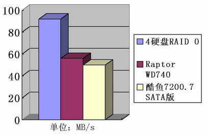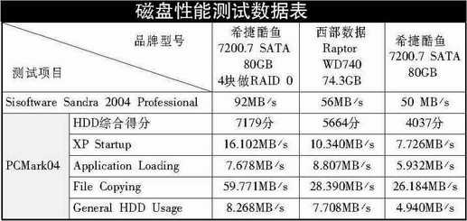 由于Sil3114和IT8212F两块控制芯片支持的RAID并不能组合,所以,我们做了两组RAID 0来最大限度发挥磁盘阵列的速度性能,并将测试对象定为SATA硬盘阵列。在Sisoftware Sandra 2004 Professional中,对比单块希捷酷鱼7200.7和10000转的西部数据Raptor硬盘,我们可以看到RAID 0在磁盘传输性能上有了相当大的提升。如果说这一数据还不够细,那么,PCMark04中磁盘性能子项得分,则更为直观地说明了问题,RAID 0的各项成绩均大幅领先于单块SATA酷鱼7200.7硬盘,在XP Startup和File Copying两个项目上,RAID 0阵列的成绩是单块SATA酷鱼7200.7硬盘得分的两倍以上。即使面对10000转的Raptor硬盘,在File Copying项目上,也是两倍于它。这些成绩,充分为我们展示了磁盘阵列的强大性能。