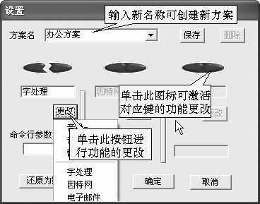 小技巧:我们也可以建立真正属于自己的功能键盘,方法很简单:只要在“设置”对话框的“方案名”旁输入名称,然后按照以上的方法分别设定三个功能键的功能,最后点击“保存”按钮就可以了。如果一种方案不够用,我们还可以通过同样的方式建立多个方案。