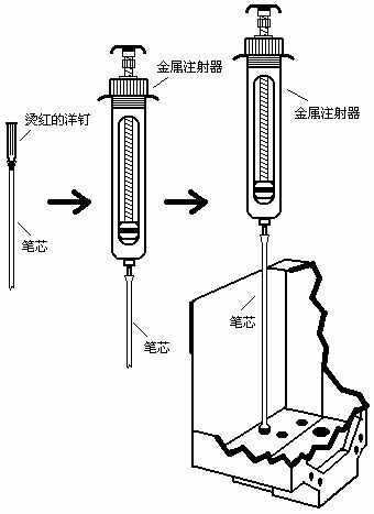 1.准备工具:注射器一支(最好是兽医用金属注射器,压强较大),圆珠笔笔芯两根(笔芯中不要有残留的笔油),适当粗细的铁钉一颗,蒸馏水或纯净水适量。