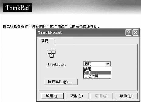 ●TrackPoint:可在该选项设置鼠标和TrackPoint(也就是常说的指点杆)的功能,点击该选项后,可以看到有“启用”、“禁用”和“自动禁用”三项选择(图1)。这个功能是IBM ThinkPad系列本本的亮点。
