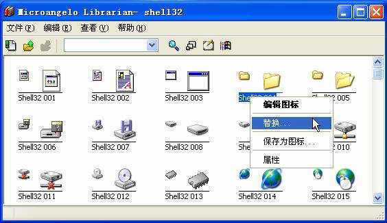 2.此时会看到Windows XP的系统图标库。接下来你要做的就是把你看不顺眼的图标换掉。例如要把文件夹的图标换掉,可右键点击文件夹的图标,选择“替换”选项(图1)。