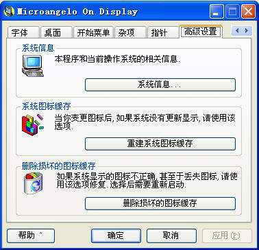 3.重新启动计算机,此时已完成了系统图标改造工程,如果在重启后发现部分系统图标还未更改过来,打开Microangelo中的On Display ,点击高级设置按钮中的重建系统图标缓存按钮即可(图2)。