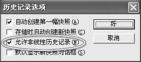 在Photoshop中打开历史记录面板,点击面板右边的黑色小三角,从弹出的对话框中选择历史记录选项。在历史记录选项对话框中,勾选“允许非线性历史记录”(图2)。