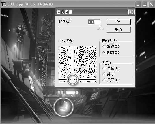 点菜单“滤镜→模糊→径向模糊”,在弹出的控制面板中进行设置。需要注意的是,模糊中心要对准图片的光源中心(图3)。