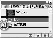 在历史控制面板中回到“打开”记录项,然后打开“径向模糊”记录历史画笔的源(图4)。