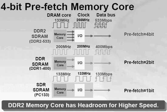 与DDR相比,DDR2最主要的改进是在内存模块速度相同的情况下,可以提供相当于DDR内存两倍的带宽。这主要是通过在每个设备上高效率使用两个DRAM核心来实现的。作为对比,在每个设备上DDR内存只能够使用一个DRAM核心。技术上讲,DDR2内存上仍然只有一个DRAM核心,但是它可以并行存取,在每次存取中处理4个数据而不是两个数据(见下图)。与双倍速运行的数据缓冲相结合,DDR2内存实现了在每个时钟周期处理多达4bit的数据,比传统DDR内存可以处理的2bit数据高了一倍。DDR2内存另一个改进之处在于,它采用FBGA封装方式替代了传统的TSOP方式。