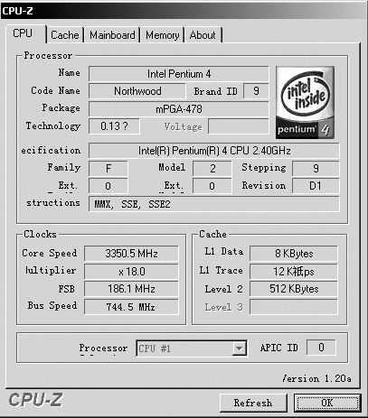 在ClockGen的帮助下,我将此CPU超到了2.8GHz,此后再高会造成系统死锁。个人感觉这块CPU应该能达到更高的高度,一定是哪个环节出了问题。笔者将目光锁定在内存上,在超频时,内存与系统工作频率为1:1。在2.8GHz时,内存工作在310MHz(155MHz×2),可能已不堪重负。于是找到一条极品DDR266内存,在DDR 266MHz状态下可以稳定工作在CAS=2上。接下来一鼓作气稳稳地将CPU锁定在3.35GHz(注:由于无法锁定PCI/AGP的频率,这个时候声卡已经不能正常工作,被我禁止掉,板载显卡还正常)。这个结果不错吧?比P4 2.4C超到3.2GHz还高呢。来看看这块CPU的一些信息(图1)。