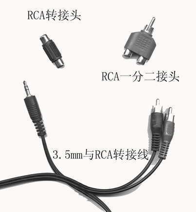 DVD光驱、带AV输出的显卡、5.1声道的声卡(当然普通立体声声卡亦可)、RCA接口视频连线、声卡3.5mm插口与功放RCA接口的转接线(图1)。