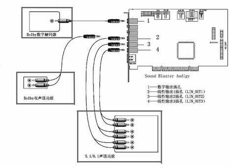 3. 如果是5.1/6.1声道功放,则要三根3.5mm插口至RCA接口的转接线,把声卡上的线性输出1~3插口按其功能,依次与功放相连,可参考声卡说明书。
