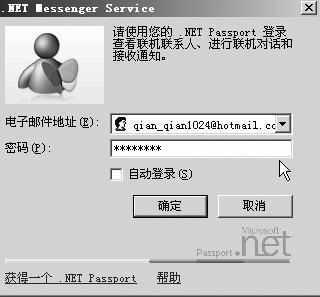 首先下载并安装MSN Messenger,本文以MSN Messenger V6.1简体中文版为例。安装完成后,MSN Messenger会自动运行并弹出登录界面。点击“按这里登录”后会弹出登录提示窗口。要使用微软的MSN Messenger我们首先要获得Hotmail的邮箱账户。点击窗口中的“获得一个.NET Passport”,根据提示完成“NET Passport向导”以及Hotmail的账户申请。例如笔者申请的qian_qian1024@hotmail.com。在登录窗口中分别在“电子邮件地址”和“密码”栏里输入刚才申请的账户信息,按下“确定”后开始登录(图1)。