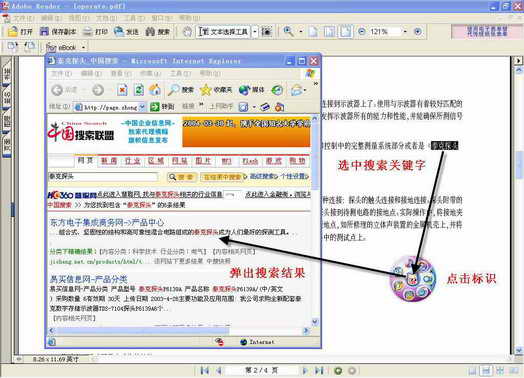 网络猪提供了完全超越传统的搜索模式,无论我们在浏览新闻还是在收发E-mail;或者在玩游戏,如果碰到我们想搜索的,只要用鼠标选中要搜索的内容,然后单击网络猪界面上的小猪标志即可进行搜索。比如我正在阅读一篇技术文档,遇到一个不懂的新名词想查看它的含义,我只要选中这个名词然后点击一下网络猪标志,搜索结果马上就会出现在面前(见图)。当然,我们也可以在网络猪所带的搜索框输入关键词或者直接用鼠标拖曳选中的关键词到搜索框里进行内容搜索。