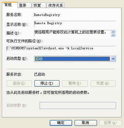 下面以Remote Registry服务为例,来看看svchost进程是如何调用DLL文件的。在WinXP中,点击“开始→运行”,输入“services.msc”命令,会弹出服务对话框,然后打开“Remote Registry”属性对话框,可以看到Remote Registry服务的可执行文件的路径为“C:\Windows\System32\svchost -k LocalService”(图1),这说明Remote Registry服务是依靠svchost调用“LocalService”参数来实现的,而参数的内容则是存放在系统注册表中的。