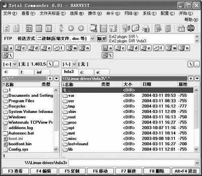 好了,现在ex2fs的插件安装好了,单击Total Commander主窗口上的“系统→网上邻居”菜单项,双击其中的“Linux drives”选项。接下来可以看到Linux分区的设备名(本例只分一个根分区/,设备名是hda3),双击即可浏览其下的内容(图2)。