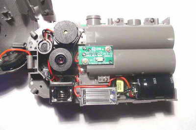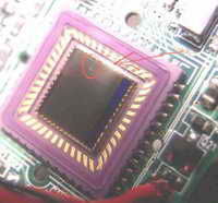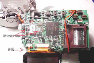 用放大镜查看镜头并未发现可疑的大块灰尘,看来不得不打开相机内部了。找一空气相对洁净的环境,用钟表十字改锥小心地拧下外壳的五颗螺钉,就可见到内部电路了(图2)。该相机镜头是由两个自攻螺钉固定在PCB板上的,但是螺钉被LCD所遮挡,所以笔者先从正面卸下固定LCD的两个对脚螺钉,将LCD轻轻翻过去,注意千万不要让排线受伤(图3)。轻轻卸下镜头,用放大镜由里往外观察,仍看不见可疑点(镜头的可调旋钮千万不要去调,也不要去清理镜头内部)。既然镜头已经被拆下,感光器件就暴露无遗了,再次用放大镜观察CMOS感光器件表面,一粒针尖般大小的棕灰色灰尘粘附在上面(见图4)。用皮老虎(吹气球)将它吹走。为防再进灰尘,笔者赶紧小心谨慎把镜头装回原位……
