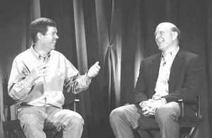 昔日怒目对视,今日笑容满面。SUN公司的CEO斯科特·麦克尼尔(图左)和微软公司的CEO斯蒂夫·巴尔默(图右)