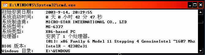 如果在Windows XP下查系统运行时间,点击“开始→运行”,输入cmd,打开命令提示符,然后在命令行下敲入“systeminfo”并回车,稍等一会儿就会看到有关自己操作系统信息的一个摘要,其中有一行为“系统启动时间”(见图)。这里的“系统启动时间”也就是指系统从启动完成到现在所经过的时间。