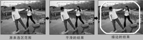 在选取的范围已经做好的状态下,执行“选择→修改→平滑”命令,在弹出的平滑设置面板中设置平滑度为“30”,此时的选区变为平滑状态。如果你想使它变为边框,执行“编辑→描边” 在弹出的描边设置面板中设置描边大小为“6”,结果如图2。