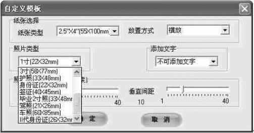 富士Photoking还提供了自定义模式,选项非常丰富,证照规格包含了社会上全部常用到的。选择自定义后出现对话框,在这里可以选择证照尺寸、间隔、添加文字等(图2)。