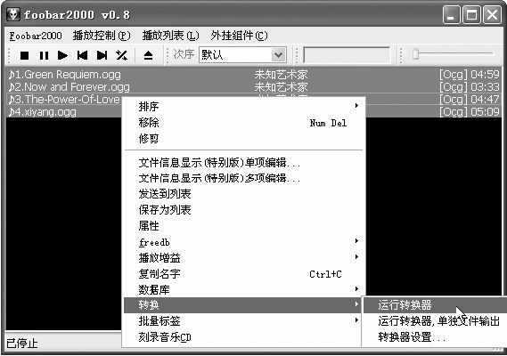 安装完成后,打开Foobar,把要转换的OGG音乐文件加入播放列表,然后在播放列表中把它们全部选定,再单击右键,选择“转换”/“运行转换器”(若选择“运行转换器,单独文件输出”则可合并输出单个音乐文件)(如图)。这时会出现一个下拉列表,在列表中选择“继承0.7输出支持:MP3(LAME)”,按“确定”选择MP3文件的输出目录后,即可开始转换。