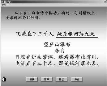 给出一句古诗和三个选择项,要求在选择项中找出与其配对的一句古诗,然后将它拖到原诗句后面,如果正确则显示这首古诗的全部内容,并伴有本诗的朗读配音;如果错误则拖动的诗句将返回原处并显示出错提示。每道题目限时10秒钟,超过10秒就提醒超时并切换到下一题。朗读古诗时可以进行控制。