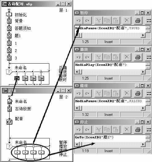 提示:执行“停止”图标即可停止播放声音文件,跳转到下一题。所以在这之前先得在程序下面放置名为“题2”的显示图标,否则无法继续。