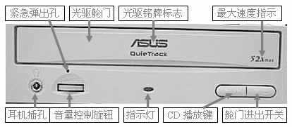 CD-ROM的面板基本组成可以见图1。在光驱面板左边有个耳机插孔,旁边是一个音量控制旋钮,光驱的商标一般也位于左上方。在右边一般有两个按键:“CD播放键”(其作用是可以不经由CPU处理而直接播放AudioCD)和“仓门进出开关”(控制仓门的进出)。
