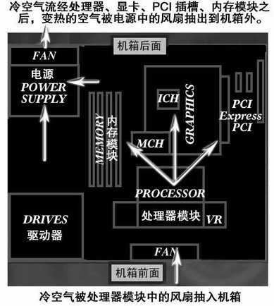 当冷空气经CPU、南北桥芯片、显卡及其他板卡之后,到主板I/O接口这一侧时,变热的气流很快就会被电源风扇抽出到机箱外。