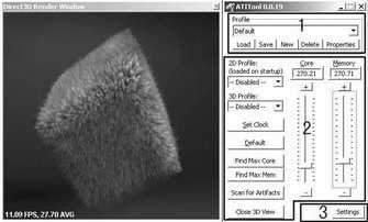 在时钟频率调节部分自上而下分别是“应用当前设定的频率(Set Clock)”、“默认频率(Default)”、“搜索核心最大时钟频率(Find Max Core)” “搜索显存最大时钟频率(Find Max Mem)”、“检验稳定性(Scan for Artifacts)”以及“显示3D演示(Show 3D View)”几部分。右侧的滑块则允许用户手动调节设置核心时钟频率及显存时钟频率。也就是说程序允许用户进行“自动”和“手动”设定。一般来说为了安全起见,还是让程序自动搜索显卡所能达到的最大也是最佳的时钟频率。你只要分别点“Find max core”和“Find max mem”两个按钮,程序即会自动按照预设的步进值逐渐提升时钟频率,而左侧3D演示程序则会测试当前频率下显卡是否正常工作。这一版本已经缩短用户漫长的等待时间了(当然不同显卡也会有不同差别),程序可以较快得出你的显卡的最佳工作频率,此时只需要点击配置文件管理模块中的“SAVE”即可。而手动调节则需要在拖动滑块到一定数值后,点击“Set Clock”才可以应用设定的值。当然,这只建议高级用户对此进行设置,因为手动设置如果不当,轻则当机,重则可能烧毁板卡。