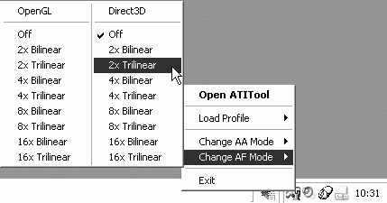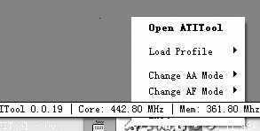 ATiTool运行后的主界面非常简单(图1)。最小化后加载在任务托盘中,右键单击图标,可以弹出控制菜单,我们可以快捷地进行一些设定。在0.0.19这版中增加了快速调整“AA”(全屏抗锯齿)和“AF”(各向异性过滤)两项功能(图2)。利用这个功能,我们可以根据需求灵活配置不同的“AA”和“AF”模式,再配合上不同的频率配置文件(后文将详细介绍),让显卡根据不同的应用动态调整显卡性能。