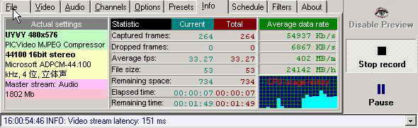 在采集视频文件时我们可以通过iuVCR的“Info”窗口了解我们正在采集的视频文件的情况(图4),其中“Captured frames”表示采集到的帧数,“Dropped frames”表示丢失的帧,“Remaining space”表示还有多少硬盘空间可用。“Average data rate”表示当前采集的视频文件的编码率。