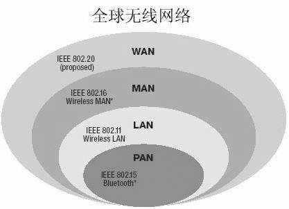 IEEE组织把无线网络标准分成以下几种(图中按照覆盖面积的大小分割):其中IEEE 802.15是个人区域网络(PAN)(如蓝牙);IEEE 802.11是我们熟知的无线局域网;IEEE 802.16为无线城域网(MAN);而IEEE 802.20是覆盖面积更广的广域网(WAN)。
