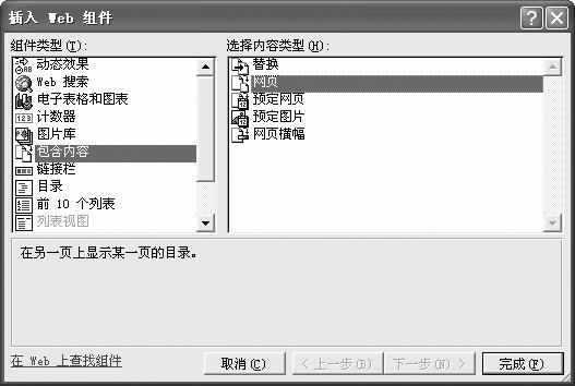 第三步,将光标移动到要包含“最新业内新闻”的表格内,选择“插入→Web组件”弹出组件窗口(见图),在左框中选中“包含内容”,右框中选择“网页”,点击“完成”后在弹出的“包含页面属性”对话框里指定刚才制作的“最新业内新闻”页面,确定操作,“最新业内新闻”页面就和这个页面融为一体了。