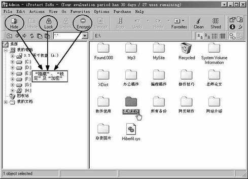 下面通过一个具体实例来说明iProtect的用法,比如要隐藏E盘下的一个叫“视频文件”的文件夹,在主界面的左侧单击E盘标记,打开E盘下的所有文件及文件夹,选中“视频文件”文件夹,在工具栏的左侧,会立刻显示三个彩色的图标(如图所示),它们分别是“Hide”(隐藏)、“Lock”(锁定)以及“Encrypt”(加密)。每个图标后面相对应的是“Unhide”(显示)、“Unlock”(解锁)及“Decrypt”(解密)。