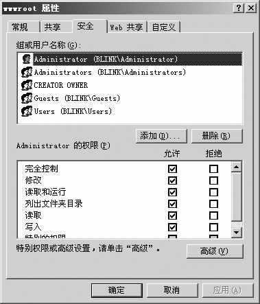 进入C:\Inetpub目录,找到wwwroot文件夹,鼠标右击并选择属性,弹出“wwwroot属性”窗口,点击“安全”选项卡(见图)。在这里,我们为给出的组或用户设定相应的权限后,问题就可得到解决了。