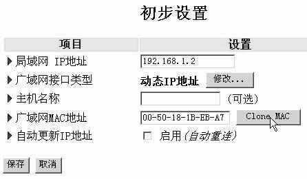 保存之后,返回“初步设置”页面,在“广域网MAC地址”栏的选项之后有一个文本框,其中的内容便是本机的MAC地址,用户可以直接在文本框中修改此MAC地址,把被绑定的网卡MAC地址填入此处。如果你不清楚网卡的MAC地址,可以点击“Clone MAC(MAC地址克隆)”按钮直接将当前计算机的网卡MAC地址克隆到TL-R400+的广域网端口。保存后重新启动路由器就可以生效了(图2)。
