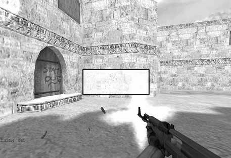 1.公众服务器上的dust2经常会有几个T攒钱买狙击枪蹲在基地看守A门冲出来的CT。由于占据明显的地形优势,CT很难成功冲出A门,因而挤在一起。这时如果你有一把AK的话就站在A门右侧墙外狠狠地往里面射击吧(见图3、4)!