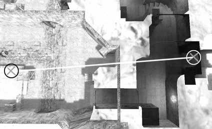 CS里所有机枪(B4*)、沙漠之鹰以及重机枪(B51)都具备穿透能力,这些枪尽管穿透障碍物后击中目标造成的伤害高低不同,但是穿透能力均相同。CS战场上大部分的双层厚度障碍都可以被子弹穿透,这里要注意的是所谓“双层障碍”,它是以CS地图里面的模块层数来决定的,和我们现实生活中对层数的理解有一定的出入。举个例子,在玩家们非常熟悉的de_aztec地图水路下,CT在大斜坡下去的位置有一个可以躲避子弹的空间(图1),虽然不算很隐蔽,但是如果事先不确认安全的话仍然会对T的进攻造成一定的影响。我们可以用穿透射击先来清理这一带潜在的威胁。穿透的位置可以选在T吊桥堡的正下方那一带(图2)。是不是觉得中间那段墙厚得有些不可思议?但从CS地图的模块来看中间只是隔了两层而已,所以一样可以利用子弹的穿透性来有效地打击敌人。