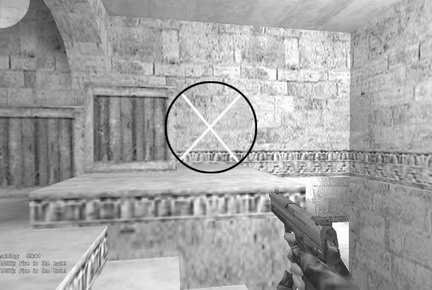 3.无论是混战还是正规比赛都经常会有人躲在dust-B洞内楼梯转弯的平台上,其实只要找准位置你就可以在B区内搞定对手。具体的穿透角度是人在埋雷点绿箱子边上,然后朝木门边上的墙角射击(见图7、8)。