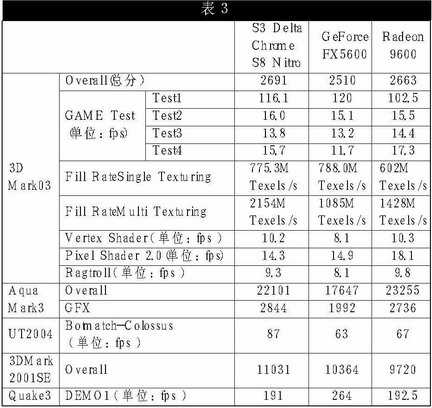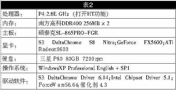 DeltaChrome的核心设计在技术规格上同NVIDIA和ATi相比毫不逊色。S8具备了4个可编程顶点渲染单元和8条像素渲染管线,128bit的显存位宽;具备多种高级渲染技术,比如高动态范围光照、高效率的Z缓冲读写、零周期Z缓冲清除等等,大大提高了对显存带宽的利用率。另外,DeltaChrome在视频处理方面也是强项,加入了多项视频特效和优化功能。我们收到的这款DeltaChrome S8的核心/显存频率为300/600MHz,显存为三星3.3ns 256MB DDR,具备VGA、DVI、S-VIDEO接口(S8技术参数详见表1,测试平台见表2)。